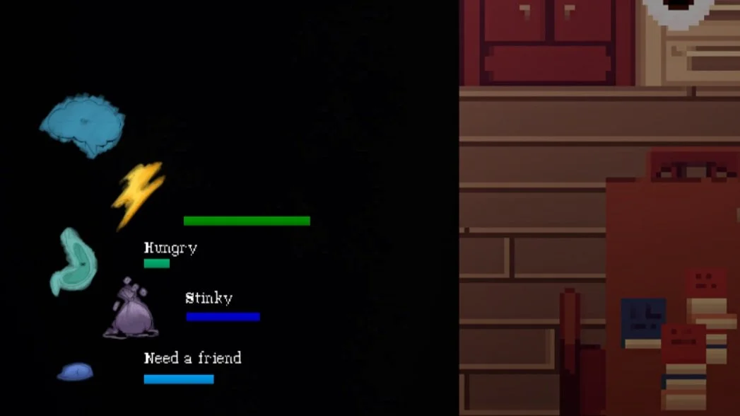 The more anxiety EYE gets, the harder doing these previously menial tasks becomes, and also makes the day go by faster and faster, making needs drain faster aswell. If anxiety hits the maximum or all needs are unmet, game over. But it´s ok, much like with real anxiety, you can always try again next week.